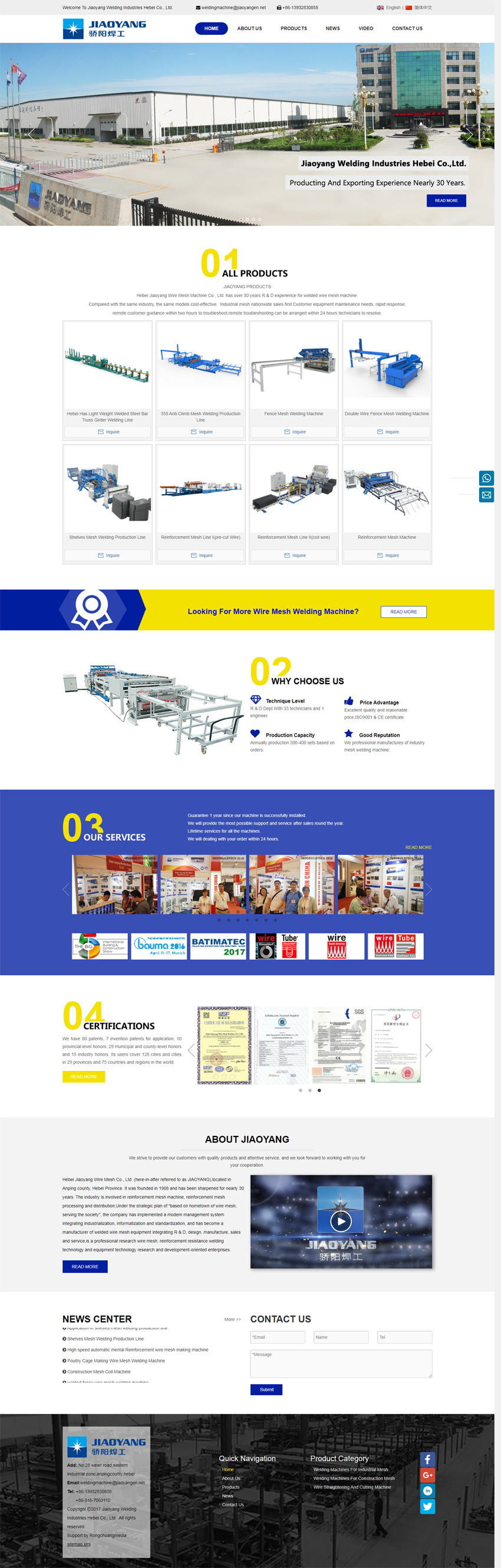 河北驕陽絲網(wǎng)設(shè)備有限責任公司坐落于聞名全國的絲網(wǎng)之鄉(xiāng)——安平,成立于2000年,占地20畝,現(xiàn)有資產(chǎn)4000萬元,員工200多人,各類技術(shù)人員70多人,機械設(shè)備100多臺套,是專業(yè)生產(chǎn)絲網(wǎng)焊接設(shè)備的制造企業(yè)。公司研制的鋼筋網(wǎng)排焊機的主要構(gòu)造先后獲得了五項國家專利,技術(shù)水平處于當今電阻焊行業(yè)的前沿。 我公司于2002年通過ISO9001質(zhì)量管理體系認證;2004年被評為項目建設(shè) 單位,2007年、2008年度信用優(yōu)良企業(yè),科技進步 單位;2006年底公司取得了自營出口權(quán);2008年4月公司研制的鋼筋網(wǎng)排焊機通過河北省產(chǎn)品質(zhì)量監(jiān)督檢驗院檢驗合格。 目前,公司產(chǎn)品銷售網(wǎng)絡(luò)已遍及新疆、黑龍江、遼寧、江蘇、內(nèi)蒙古、海南、廣西、廣東、湖南、湖北、上海、福建、浙江、海南、北京等全國各地,并出口至加拿大、烏克蘭、伊朗、新西蘭、泰國、俄羅斯、南非、印度、巴基斯坦、韓國等30多個國家和地區(qū)。 今天的驕陽已發(fā)展成集研發(fā)、設(shè)計、制造、貿(mào)易為一體的綜合性實體公司,驕陽人一如既往地秉承之前的創(chuàng)業(yè)精神,引進與運用現(xiàn)代化的管理模式,迎合未來的市場需求,竭力滿足不同客戶的需求,力爭早日把驕陽打造成中國的民族品牌!